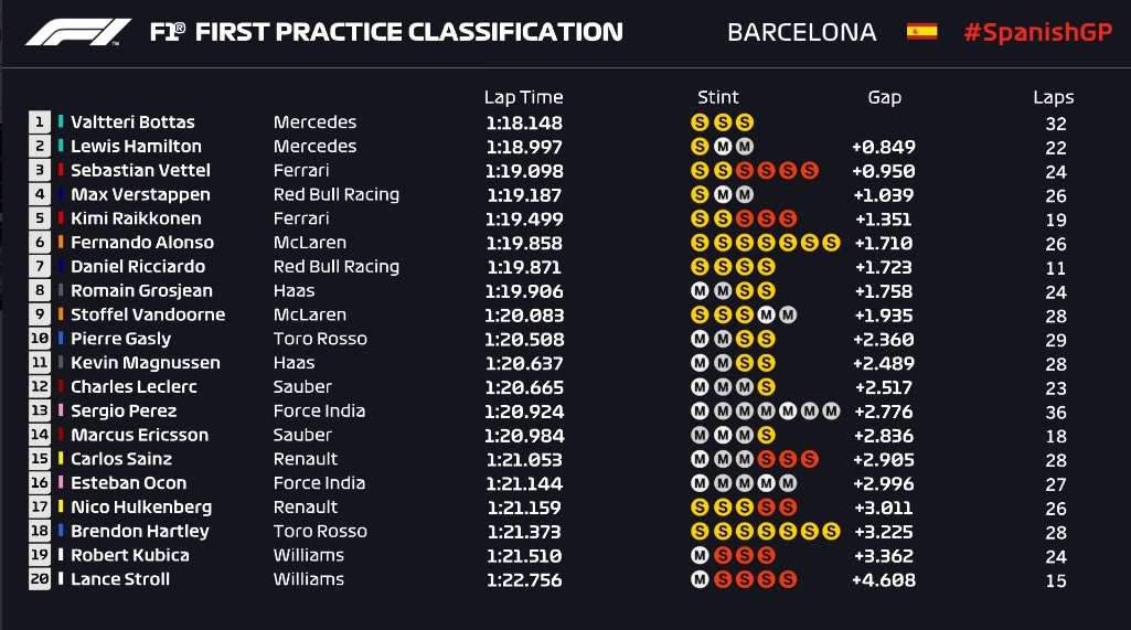 Valtteri Bottas je postavio najbrže vrijeme prvog slobodnog treninga u Španjolskoj. Slijedi ga momčadski kolega, Lewis Hamilton, dok je trećeplairani Sebastian Vettel.