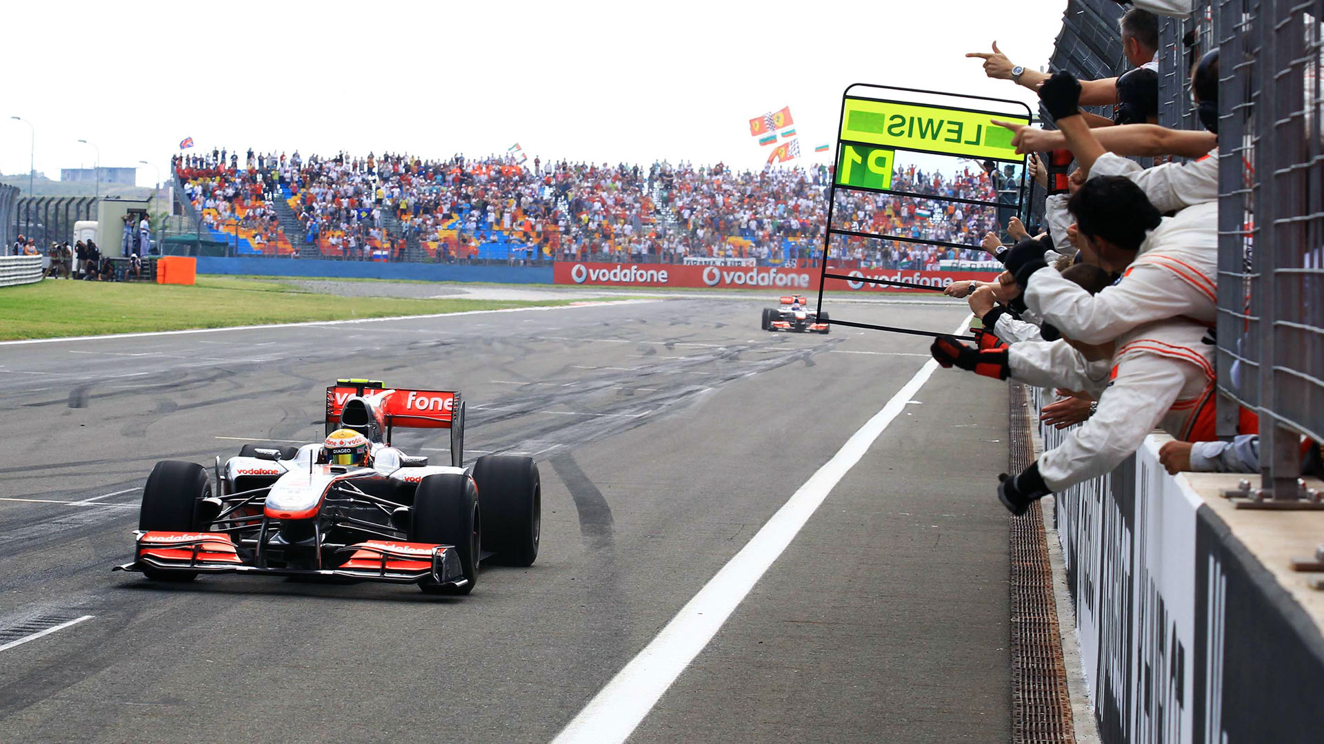 Iskoristivši ovaj poklon, McLaren je preuzeo prve dvije pozicije u utrci, s Hamiltonom na vrhu. Idila je trajala samo osam krugova, kada je na istome mjestu navedenog incidenta, započeo novi dvoboj dvojice momčadskih kolega. Ovaj put je Button napao Hamiltona za prvo mjesto u poretku, a publika je ponovno zadržala dah. Ipak Britanci su bili puno oprezniji i dopustili su da samo izravno utrkivanje kroz naredni krug odluči pobjednika.
