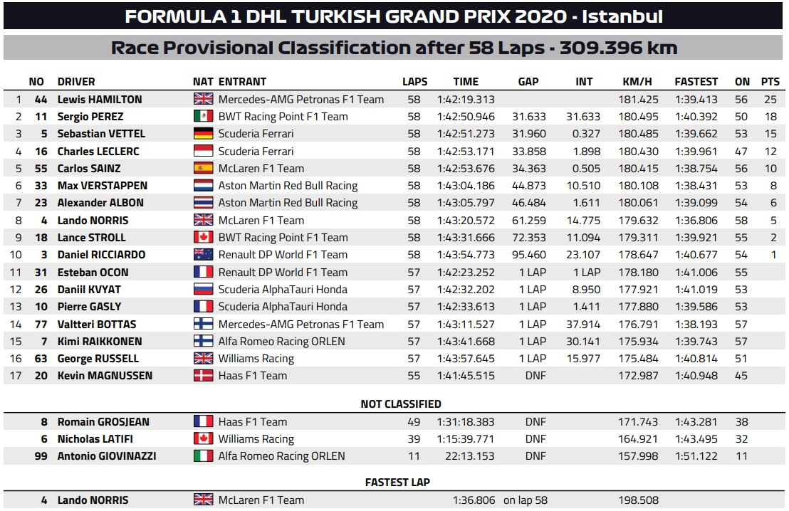 Pobjednik hladne, kišne i uzbudljive utrke za VN Turske na stazi Istanbul Park po 94. put u svojoj karijeri je Lewis Hamilton u Mercedesu i time je osigurao sedmi naslov prvaka! Drugi je završio Sergio Perez u Racing Pointu. Fantastičnu utrku su, za promjenu, imali u Ferrariju. U zanimljivoj i dramatičnoj završnici Sebastian Vettel je prestigao momčadskog kolegu za treće mjesto. Tako je Charles Leclerc završio četvrti, što je za momčad iz Maranella najbolji rezultat dosad.