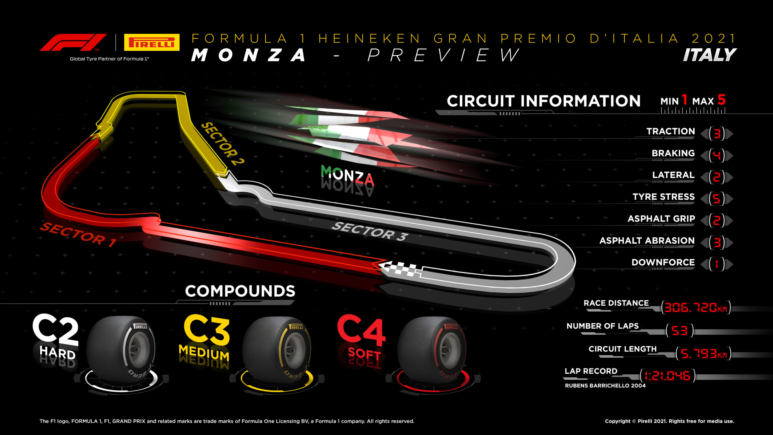 Imajući sve to na umu, Pirelli na Monzu donosi dva seta tvrdih guma komponente C2, četiri seta srednjih guma komponente C3 te šest setova mekih guma komponente C4.