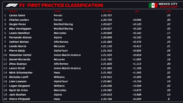 Započelo je sedmo izdanje Velike nagrade Meksika u ovoj modernoj F1 eri. U petak rano poslijepodne po lokalnom vremenu održan je prvi slobodni trening, na kojem je najbolje vrijeme postavio Carlos Sainz u bolidu Ferrarija. Njegov najbrži krug bio je 1:20,707.