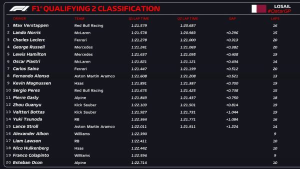 Završene su kvalifikacije na Velikoj nagradi Katara, a najbrži krug u završnoj rundi odvozio je Max Verstappen u bolidu Red Bulla. Drugi je bio George Russell, a vozačima McLarena ovoga je puta izmakao prvi startni red. Lando Norris smjestio se na treću, a Oscar Piastri na četvrtu poziciju.