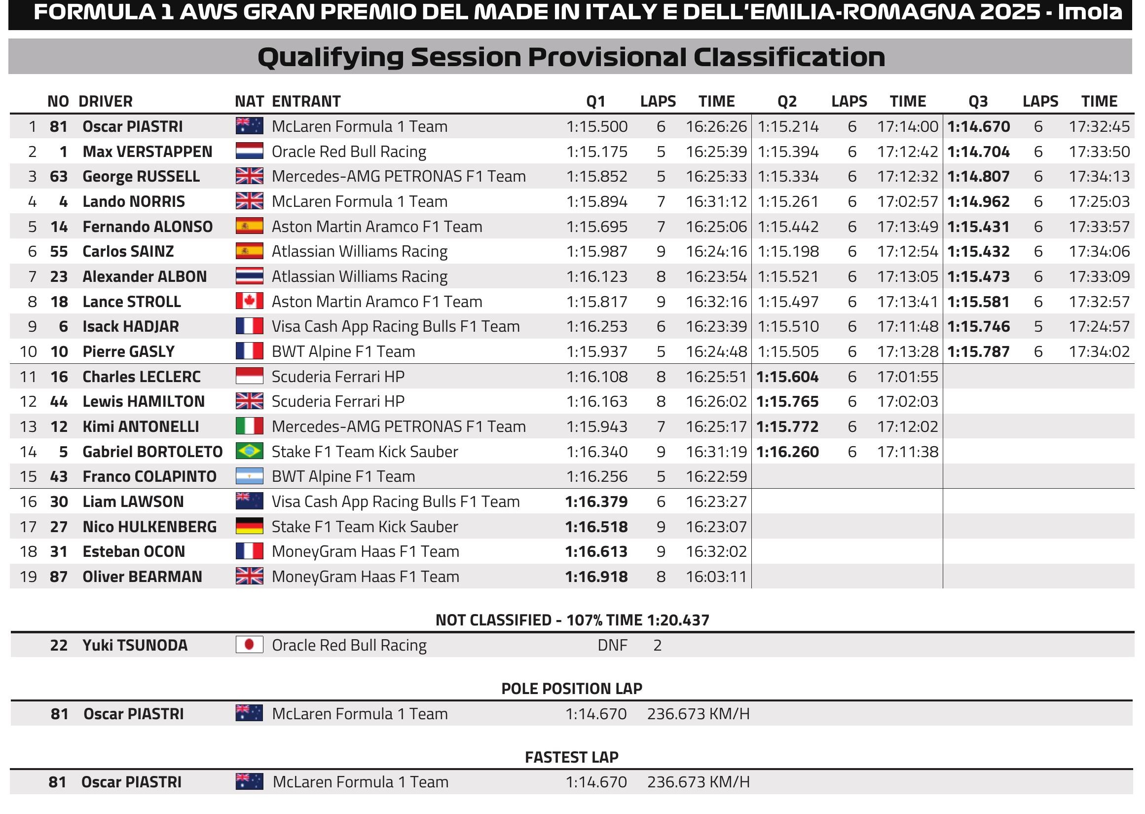 U završne krugove nisu svi krenuli na mekoj komponenti. McLareni i Verstappen su ostali na mekoj komponenti. Opet se između njih vodila velika borba. Prvo je Piastri odvozio najbrže vrijeme. Norris i Verstappen su imali nešto slabiji drugi sektor. Norris na kraju nije poboljšao svoje vrijeme, kao ni Verstappen. Još je Russell na srednje tvrdim gumama odvozio treće vrijeme i tako gurnuo Norrisa na četvrto mjesto. Piastri je ovako osvojio prvi pole position u Imoli za McLaren još od 2005. i Kimija Raikkonena.