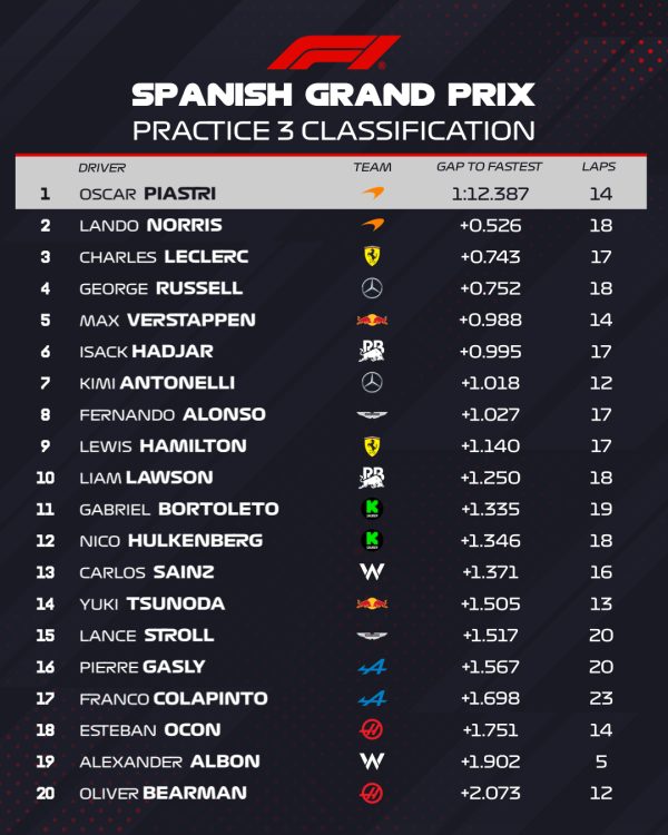 Treći trening u prvih deset završili su još Antonelli, Alonso, Hamilton i Lawson. Dobri su bili momci iz Saubera, Bortoleto i Hülkenberg, na 11. i 12. mjestu. Tsunoda je bio tek 14., a koliko se može zaključivati po rezultatima treninga, situacija nije najbolja niti za Williams. Sainz je bio 13., a Albon 19. U donjem dijelu poretka ostali su i vozači Alpinea te Haasa.
