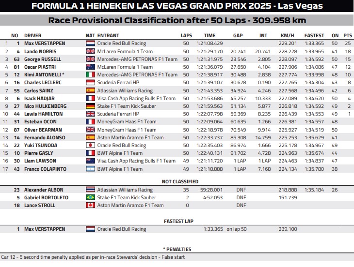 Pobjednik spektakla u glavnom gradu kocke je bio Max Verstappen u Red Bullu. Ovim je postao prvi vozač s dvije pobjede u Las Vegasu, te je ostvario svoju 69. pobjedu u karijeri. Odličnim startom se probio ispred Landa Norrisa u McLarenu koji je utrku završio kao drugi. Treći je završio George Russell u Mercedesu iako je na startu prestigao Norrisa, ali je kroz bokseve izgubio tu zarađenu poziciju. Nakon ove utrke Max je ostao i dalje s malim šansama za naslov prvaka, a Norris je još povećao prednost ispred Piastrija.