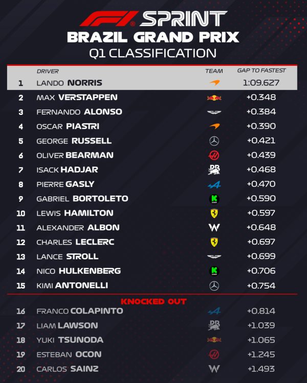 Za Landa Norrisa ovo je prvi put ove sezone da je uspio biti najbrži u sprint kvalifikacijama, a četvrti put ukupno u njegovoj karijeri. Zanimljivo je da ove sezone imamo pet različitih pobjednika u isto toliko sprint kvalifikacija: Hamiltona u Kini, Antonellija u Miamiju, Piastrija u Belgiji, Verstappena u Austinu i Norrisa u Sao Paulu.